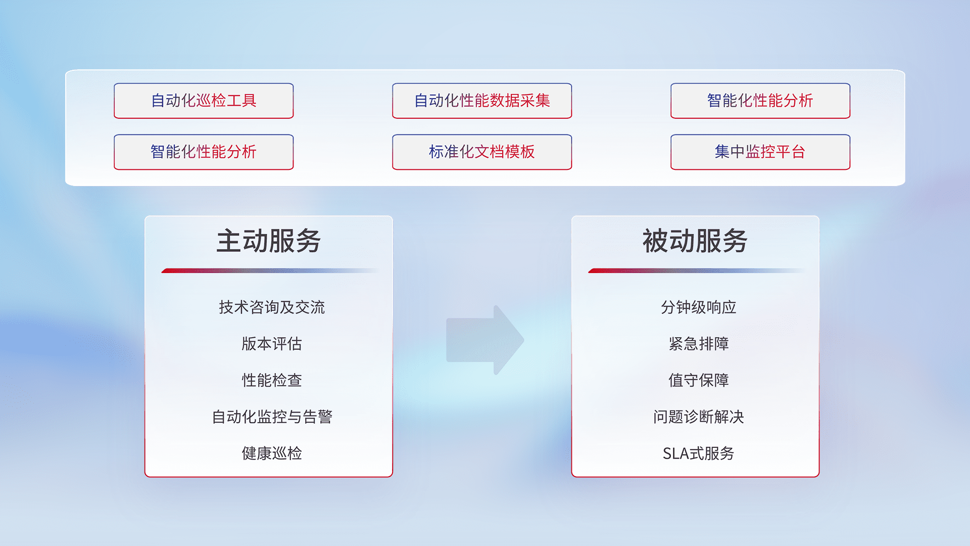 智能化工具和标准化文档,,,保障服务质量,,,提供主动服务(包含技术咨询、、、版本评估、、性能检查、、、、自动化监控与告警、、、、健康巡检)和被动服务包含(分钟级响应、、、紧急排障、、、值守保障、、、、问题诊断解决、、、SLA服务)。。。。